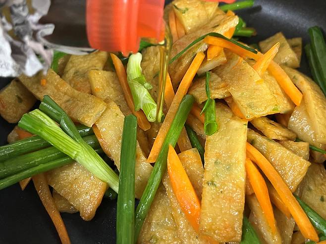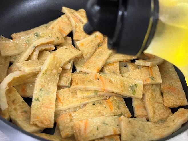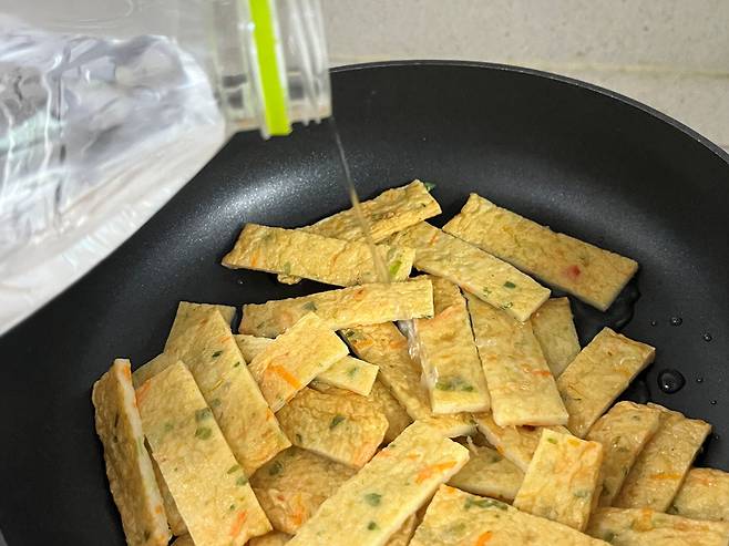 부드러우면서 냉장고 넣어도 촉촉한 어묵볶음 핵심은 바로 "물"을 넣고 먼저 볶는 겁니다. 어묵을 팬에 넣고 기름 붓기 전, 물 4~5 스푼 넣어 1차적으로 볶아 주세요. 약불로 팬 바닥에 물이 증발할 때까지 볶습니다.