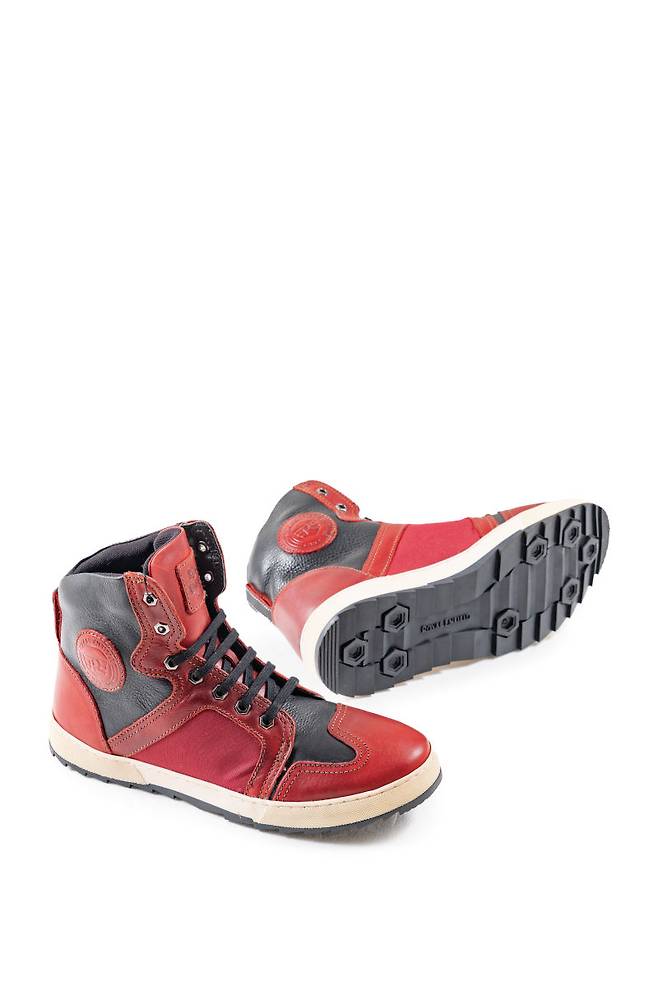 깊이 있는 레드 컬러 가죽을 사용해 클래식 스타일에 고급스러운 느낌을 풍기는 로얄엔필드 라이딩 슈즈. 풀 그레인 가죽을 적용했다. 발목에는 가죽으로 된 로얄엔필드 보호대를 적용해 안전성과 멋을 더했다.