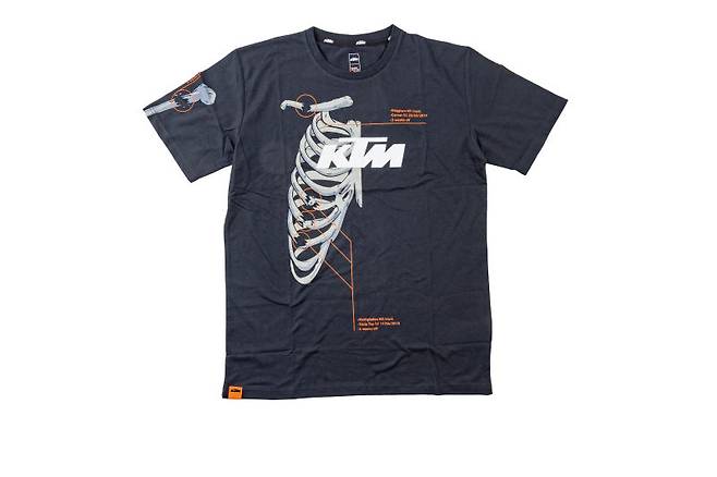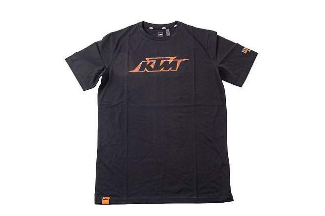 독특한 오렌지 카무플라주 테두리가 포인트가 되는 KTM 티셔츠. 왼팔에는 KTM이 표방하고 있는 ‘READY TO RACE’ 레터링 로고가 프린트되어 있다.
