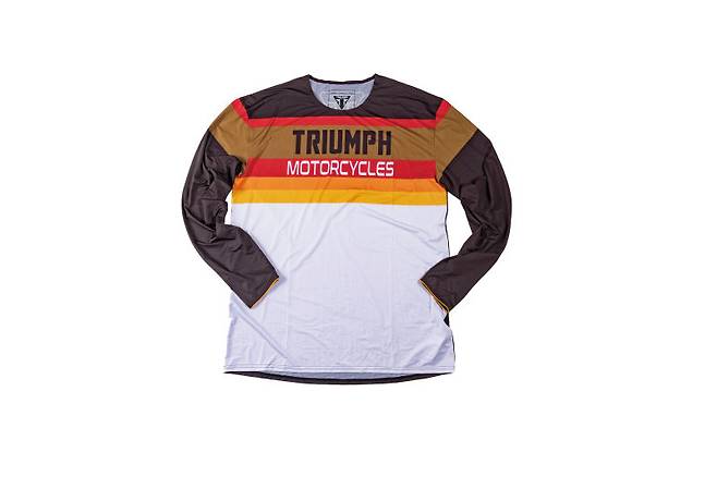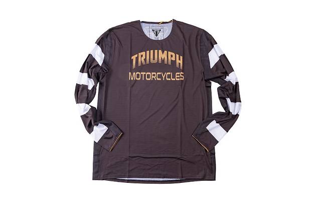 슬리브에 스트라이프 패턴이 포인트가 되는 트라이엄프 오프로드 저지. 가슴에 금색으로 트라이엄프 로고가 심플하게 프린팅되어 있다. 상체 옆면과 팔 안쪽에는 더 큰 사이즈의 구멍이 뚫려있는 스트레치 메시가 적용되어 있다. 손목에는 펄럭임을 방지하기 위해 스트레치 소재가 적용되어 있다.