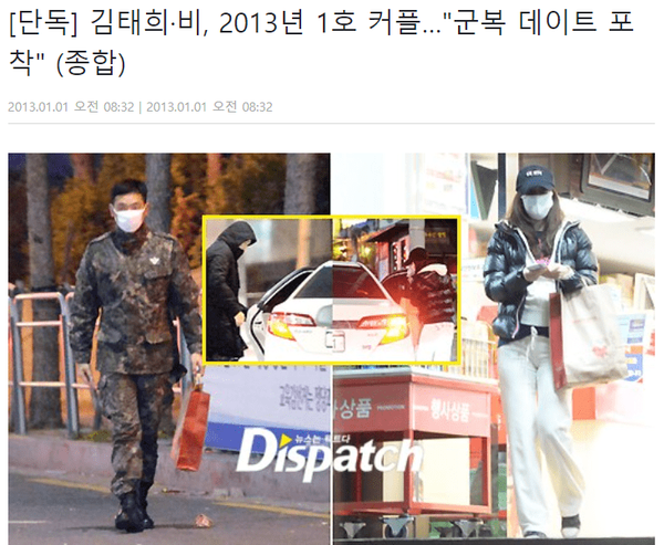 그런 비의 진심이 닿은 건지, 광고 촬영을 계기로 연락처를 교환한 두 사람은 조심스럽게 연락을 이어가던 두 사람은 2013년 1월, 디스패치에 의해 열애설이 보도됩니다.