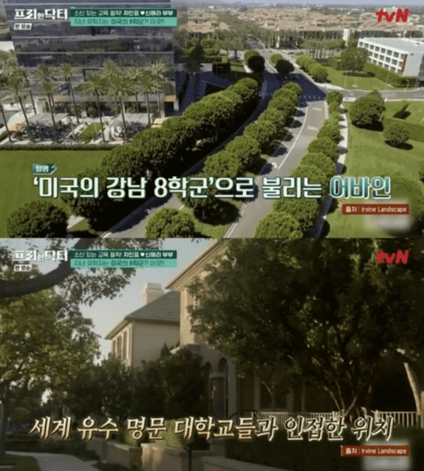 어바인은 연예계 스타들이 자녀의 유학을 위해 많이 고려하는 곳입니다. 신애라가 자녀 교육을 위해 갔던 곳이기도 하며 그 외에도 손지창·오연수 부부, 이재룡·유호정 부부, 한석규 자녀들도 어바인에서 유학한 이력이 있습니다.