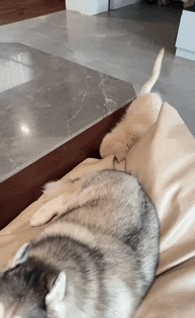 시베리안 허스키는 이러한 골든 리트리버의 끊임없는 장난에 지친 듯한 표정을 짓기도 합니다.