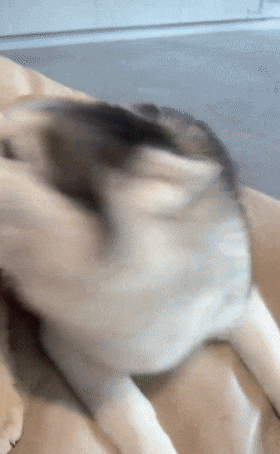 정면 대결이 어렵다는 것을 깨달은 골든 리트리버는 시베리안 허스키의 뒤로 돌아가 꼬리털을 잡아당기는 영리한 모습을 보입니다.