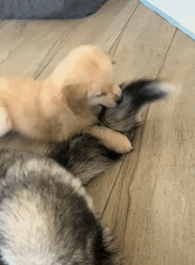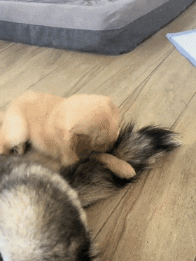 이 골든 리트리버 강아지는 쉴 새 없이 시베리안 허스키에게 다가가 꼬리털을 잡아당기며 놀고 싶어 합니다. 이갈이 시기의 골든 리트리버는 눈에 보이는 모든 것을 씹는 습성을 보이는데, 심지어 주인까지도 예외는 아닙니다.