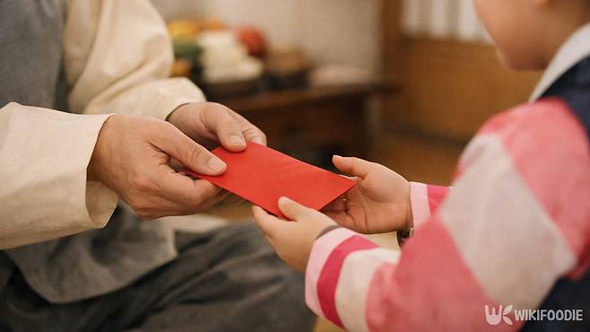 세배를 마친 아이가 어른으로부터 세뱃돈을 받고 있다. / 위키푸디