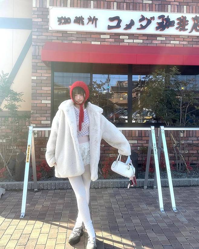 겨울 감성을 한껏 살린 그녀의 스타일링은 마치 겨울날의 딸기를 연상시킨다. 빨간색과 하얀색의 조화는 사랑스럽고 따뜻한 분위기를 자아내며, 페미닌한 감각까지 더해진다. 이런 스타일링은 추운 날씨에도 스타일과 보온성을 모두 챙길 수 있는 완벽한 조합이다.