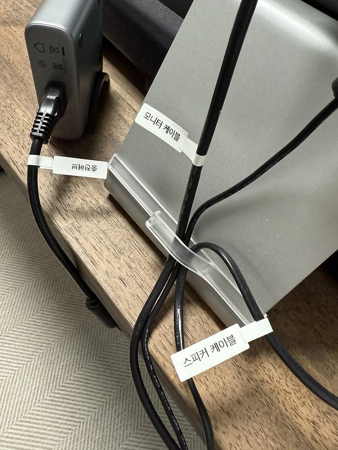 USB-C, HDMI, 프린터, 허브, 충전기 등 기기마다 연결된 케이블들을 제각각이라 찾기 어려웠는데, 케이블 전용 라벨지를 활용하니 한눈에 파악이 가능해졌습니다.