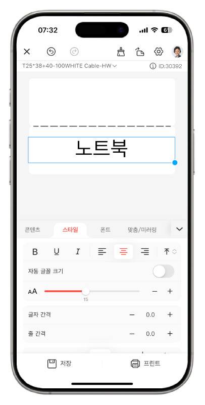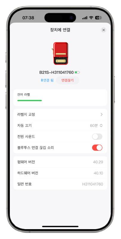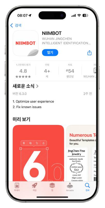 라벨 인쇄는 님봇 전용 앱인 Niimbot을 통해 진행됩니다. 앱 설치 후 블루투스로 간편하게 라벨 기와 연결되며, 인터페이스가 직관적이라 금방 익숙해질 수 있습니다.
