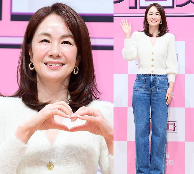 미스코리아 출신 배우 장윤정이 화이트 니트 카디건과 데님 팬츠로 ‘러블리 캐주얼’의 정석을 선보였습니다.