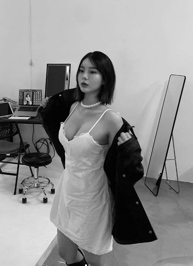 맹승지는 14일 자신의 SNS 계정을 통해 슬림 드레스를 입고 화보 촬영 현장을 공개했다.