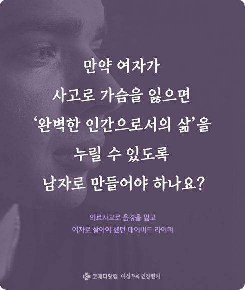 14세 때 브렌다는 다시 데이비드로 태어납니다. 성서에서 다비드의 이름을 따와 용기 있는 삶을 살겠다고 다짐하면서…. 형식적이나마 음경 재건 수술을 받았으며 양쪽 유방을 절제했습니다. 가슴도 떨어져 나갔지만, 여자로서 맺었던 친구들도 함께 떨어져 나갔습니다. 데이비드는 25세 때 미혼모와 결혼하며 운명과 맞서며 앙버텼지만, 동생이 항우울증 과다 복용으로 숨진 뒤 괴로워하다 38세 때 권총으로 삶을 마감합니다.