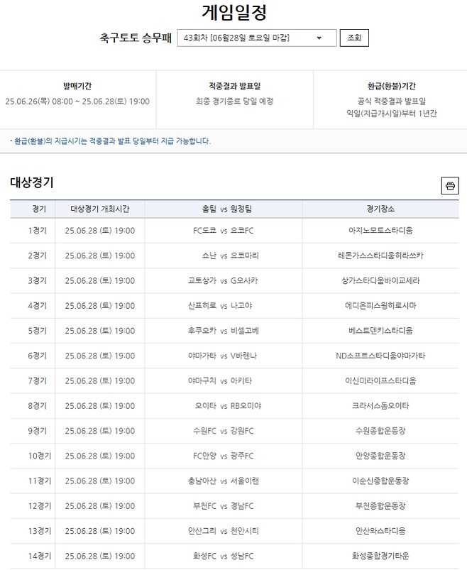 K리그 및 J리그 14경기 대상, 결과는 다수 무승부 발생…43회차 오는 26일 오전 8시 발매 개시